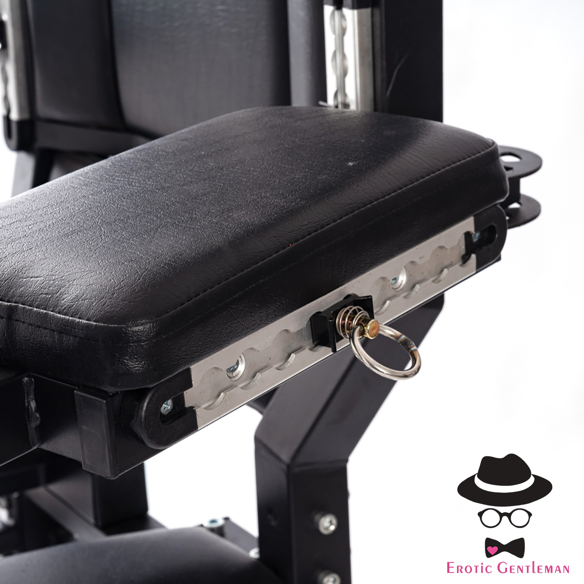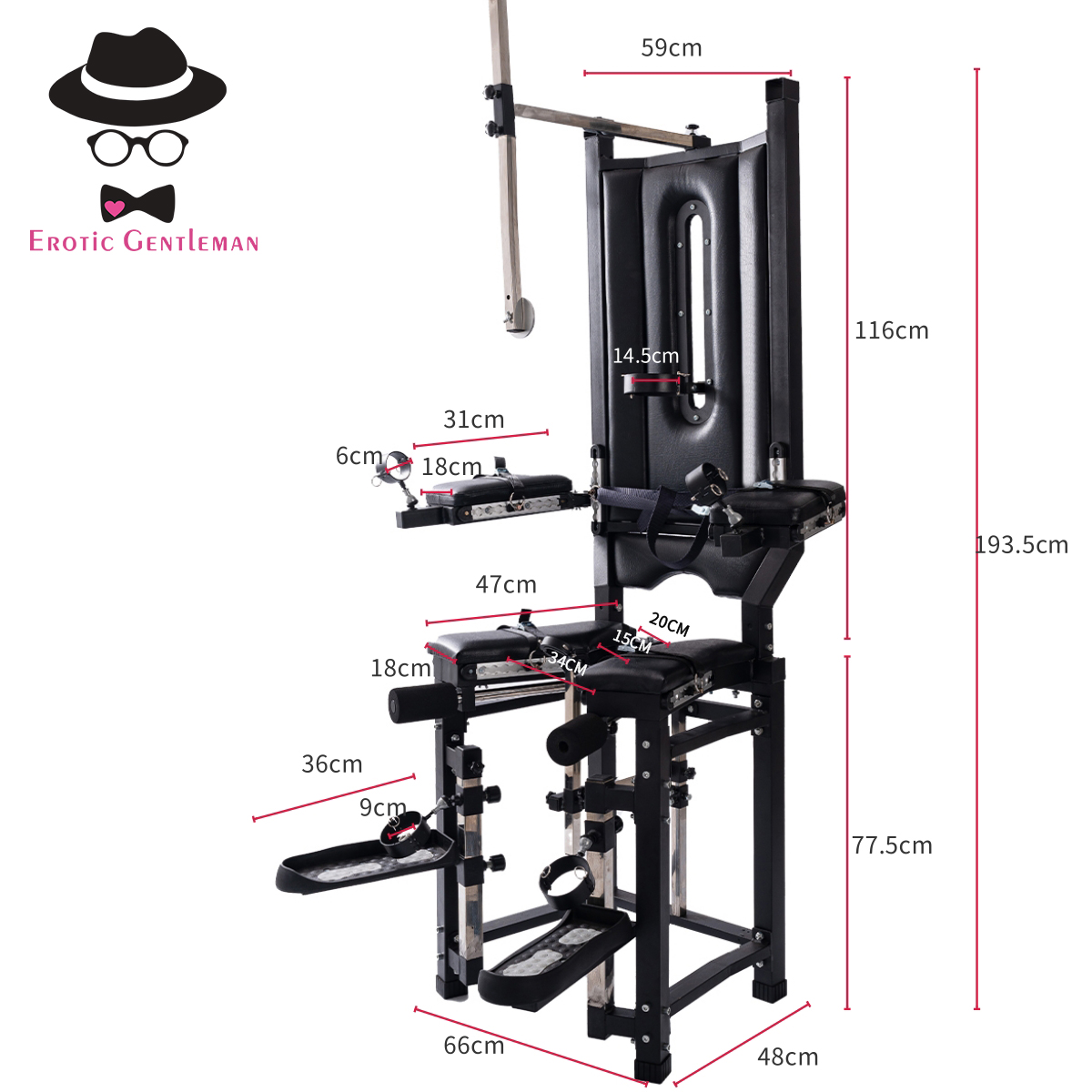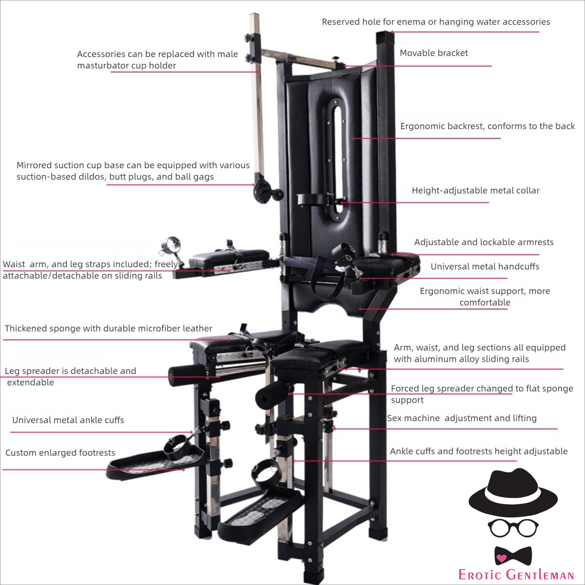 1.Accessories can be replaced with male masturbator cup holder; 2.Reserved hole for enema or hanging water accessories; 3.Movable bracket; 4.Mirrored suction cup base can be equipped with various suction-based dildos, butt plugs, and ball gags; 5.Ergonomic backrest, conforms to the back; 6.Height-adjustable metal collar; 7.Adjustable and lockable armrests; 8.Universal metal handcuffs & ankle cuffs; 9.Ergonomic waist support, more comfortable; 10.Waist arm, and leg straps included; freely attachable/detachable on sliding rails; 11.Arm, waist, and leg sections all equipped with aluminum alloy sliding rails; 12.Thickened sponge with durable microfiber leather; 13.Leg spreader is detachable and extendable; 14.Forced leg spreader changed to flat sponge support; 15.Sex machin with adjustable lift; 16.Custom enlarged footrests; 17.Ankle cuffs and footrests height adjustable; |